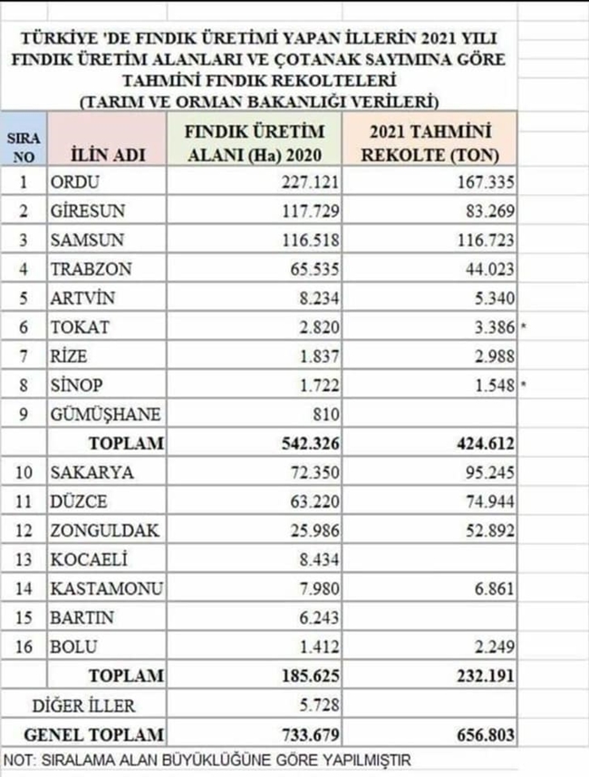 En çok üretim Ordu’da. Ordu’nun tahmini rekoltesi 167 bin 335 ton olarak hesaplanmıştı.
