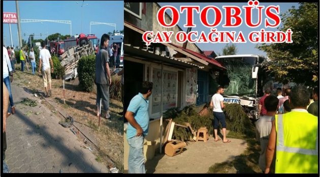 Bursa’dan Trabzon’a giden yolcu otobüsü Fatsa’da Büyük Sanayi Sitesi Kavşağı’nda dönüş yapmak isteyen kamyonete çarptı. Hızını alamayıp yoldan çıkan otobüs yol kenarındaki çay ocağının duvarına vurarak durabildi. Otobüsün çarptığı kamyonet ise su kanalına düştü.
