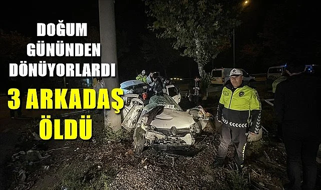 Bursa'da doğum günü eğlencesinden dönen 4 arkadaşın bulunduğu otomobil, beton aydınlatma direğine çarptı. Kazada 3 kişi öldü, 1 kişi ağır yaralandı.