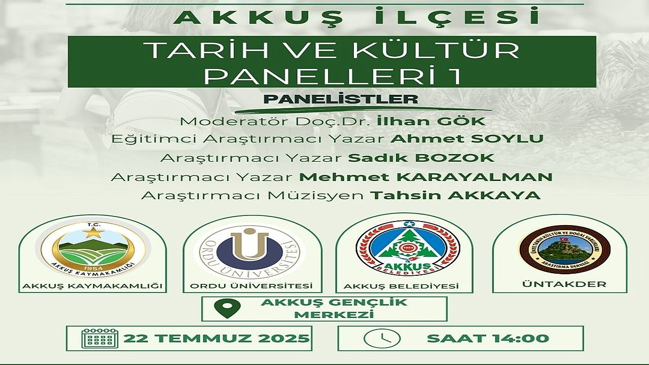 Akkuş’un tarihi ve kültürel değerlerinin ele alınacağı “Akkuş İlçesi Tarih ve Kültür Panelleri”nin ilki 22 Temmuz Pazartesi günü düzenlenecek. Ünye Tarih Kültür ve Doğal Varlıkları Araştırma Derneği öncülüğünde Akkuş Kaymakamlığı, Akkuş Belediyesi, Ordu Üniversitesi ve Ordu Büyükşehir Belediyesi iş birliğiyle gerçekleşecek panel, Akkuş Gençlik Merkezi Konferans Salonu’nda yapılacak.