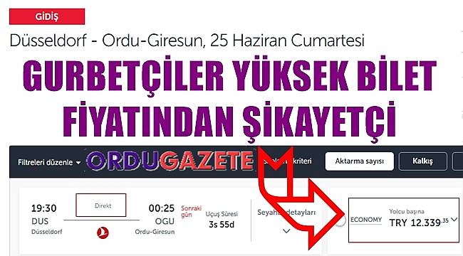 Almanya Duesseldorf –Ordu Giresun Havalimanı arasında cumartesi günü yapılacak sefer için THY bilet fiyatını 12 Bin 339 TL’den satıyor. Bilet fiyatlarının ortalama 6-7 Bin TL arasında olduğu, doluluk oranı ile birlikte fiyatların arttığı ifade ediliyor.