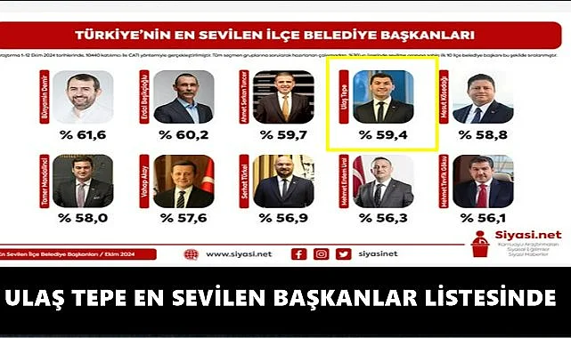 Altınordu Belediye Başkanı Ulaş Tepe, Siyasinet’in 1-12 Ekim 2024 tarihleri arasında yaptığı kamuoyu araştırmasında, Türkiye genelinde en sevilen ilçe belediye başkanları arasında 4. sırada yer aldı. Araştırma, 10.440 kişinin katılımıyla gerçekleştirildi.