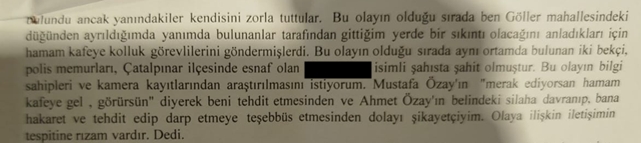 Erkan Türkan, şikayet dilekçesinin son bölümünde şunları söyedi; Bu olayın olduğu sırada aynıortamda bulunan iki bekçi,polis memurları, Çatalpınar'da esnaf olan U.E. isili şahıs vardı.B layın blgi sahibi ve kamera kayıtlarının araştırılmasını istiyorum.Mustafa Özay'ın " Hamam Cafeye gel görürsün " diyerek beni tehdit etesinden, Ahmet Özay'ın belindeki silaha dayanıp bana hakeret ve tehdt edip darp etmeye teşebbüs etmesinden dolayı şikayetçiyim. Erkan Türkan'ın şikayeti üzerine Fatsa Cumhuriyet Basavcılığının adı anılan şahıslar hakkında soruşturma başlattığı öğrenildi.