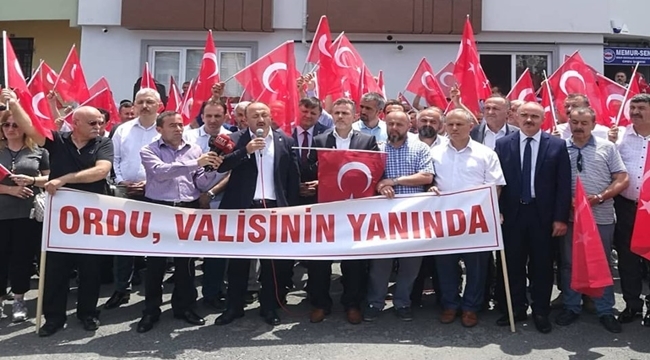 Memur-Sen Ordu Şubesi öncülüğünde, sendika binası önünde toplanan 30'a yakın sivil toplum kuruluşunun temsilcisi ve üyeleri, "Ordu, valisinin yanında" sloganı attı.