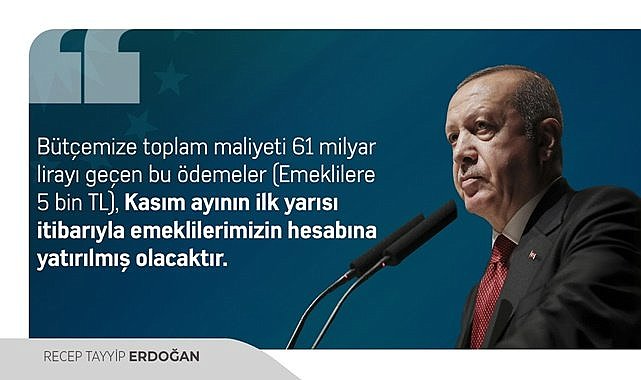 Cumhurbaşkanı Erdoğan, "Emeklilerimize bir defaya mahsus olmak üzere 5 bin lira ödeme yapmayı kararlaştırdık. Bütçemize maliyeti 61 milyar lirayı geçen bu ödemeler, kasım ayının ilk yarısı itibarıyla emeklilerimizin hesabına yatırılmış olacak." dedi.