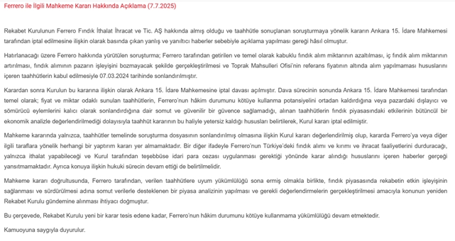 Rekabet Kurumu, Ferrero Fındık İthalat İhracat ve Tic. AŞ hakkında alınan karara dair Ankara 15. İdare Mahkemesi tarafından verilen iptal kararı sonrası basında yer alan haberlerin yanlış ve yanıltıcı olduğu gerekçesiyle kamuoyuna açıklama yaptı.