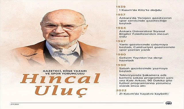 İSTANBUL (AA) - Bir süredir yaşadığı sağlık sorunları nedeniyle hastanede tedavi gören gazeteci, yazar ve spor yorumcusu Hıncal Uluç 83 yaşında vefat etti.