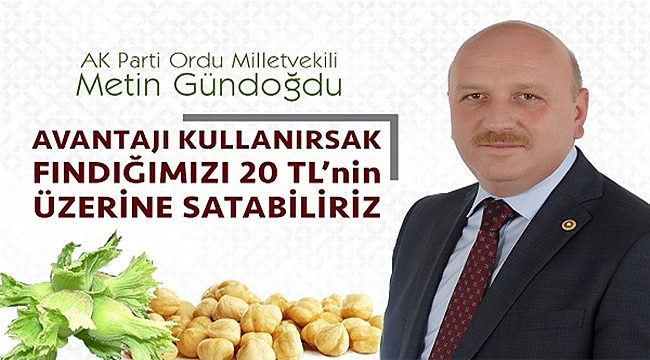 Cumhurbaşkanı Recep Tayyip Erdoğan’ın levant kalite fındığı 16,5 TL’den alacağını açıklamasının ardından konuşan AK Parti Ordu Milletvekili Metin Gündoğdu “Stratejik davranırsak fındığımızı 20 TL’nin üzerinde bir fiyata satabiliriz.” dedi.