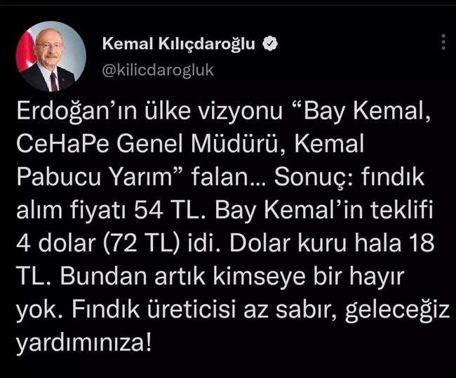 Erdoğan'ın ülke vizyonu "Bay kemal, CeHePe Genel Müdürü,Kemal papucu yarım" falan...Sonuç fındık alım fiyatı 54 TL. Bay kemal'in teklifi 4 dolar (72TL) idi.Dolar kuru hala 18 TL. Bundan artık kimseye bir hayır yok.Fındık üreticisi az sabır geleceğiz yardımına!