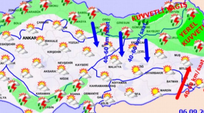 KUVVETLİ RÜZGAR UYARISI: Rüzgarın Marmara'nın batısı, Kıyı Ege ve Orta Karadeniz'in iç kesimlerinde kuzey yönlerden, Doğu Anadolu'nun güneydoğusunda güneybatı yönlerden kuvvetli (40-60 km/sa) esmesi beklendiğinden yaşanabilecek ağaç ve direk devrilmesi, çatı uçması ve ulaşımda aksamalar gibi olumsuzluklara karşı dikkatli ve tedbirli olunması gerekmektedir.