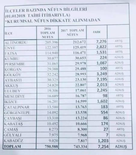İlçeler arasında geçen yıla göre Altınordu 7 bin 276, Ünye 2 bin 822,Fatsa bin 531 ,Korgan 100,Mesudiye 98,Çatalpınar 183, Çamaş 27 kişi artış sağlarken diğer 12 ilçede nüfus düştü.