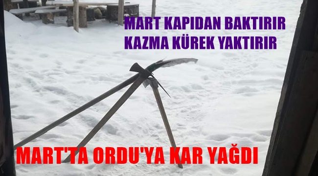 “Mart kapıdan baktırır, kazma kürek yaktırır” atasözü Ordu’da gerçek oldu. 1 Mart 2022 Salı günü Ordu’da yüksek kesimlere kar yağdı. Kabadüz Çambaşı Yaylası’nda Serdar Şimşek, kazma, kürek ve nacakla çektiği fotoğrafı “ Mart kapıdan baktırır, kazma kürek yaktırır” atasözüyle paylaştı. Yağışlı hava Cuma günü sona eriyor . Ancak hafta sonu bölgemizde yağışlı hava yine etkili olacak.