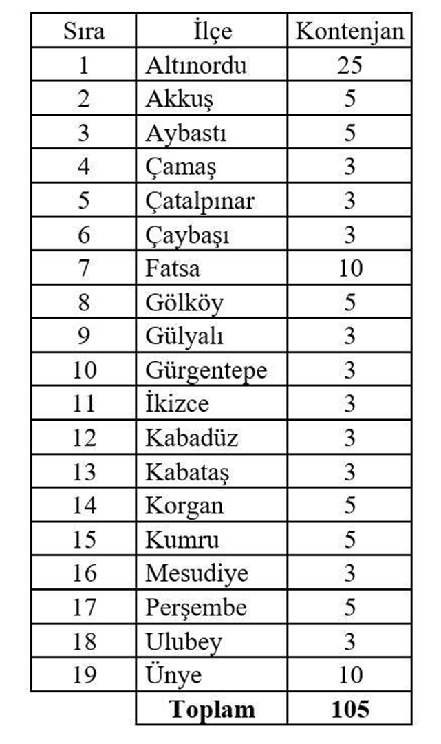 En fazla kontenjan 25 kişiyle Altınordu’ya ayrılırken, Fatsa ve Ünye’de 10’ar kişilik kontenjan bulunuyor.