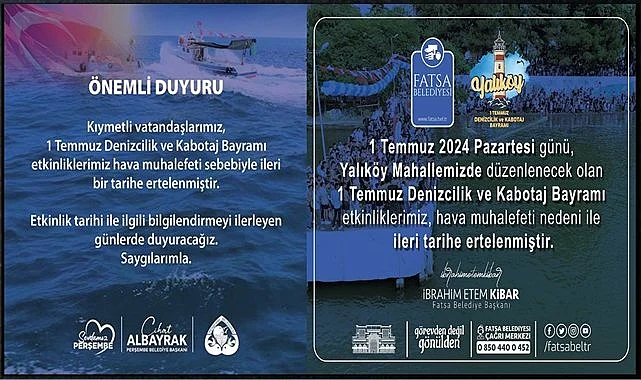 Fatsa Belediyesi tarafından Yalıköy'de kutlanan 1 Temmuz Denizcilik ve Kabotaj Bayramı kutlamaları da ileri tarihe ertelendi. Fatsa Belediye Başkanı İbrahim Etem Kibar, "Değerli hemşehrilerimiz, yarın gerçekleştirmeyi planladığımız Geleneksel 1 Temmuz Denizcilik ve Kabotaj Bayramı etkinlikleri hava muhalefeti sebebiyle ileri bir tarihe ertelenmiştir." açıklamasını yaptı.