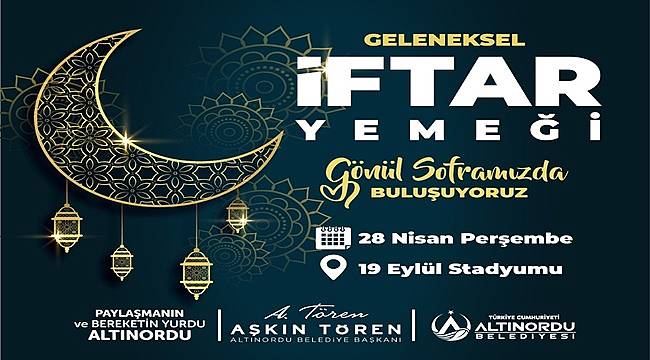 Herkesi 28 Nisan Perşembe günü 19 Eylül Stadyumu’nda Altınordu Belediyesi’nin düzenlediği “şehir iftarı” programına davet eden başkan Tören, “yarın akşam iftar saatinde 19 Eylül Stadyumunda şehir merkezimizde bulunan şehir stadyumumuzda tüm hemşehrilerimizi 7’den 70’e gönül soframızda bir arada olmaya davet ediyorum.
