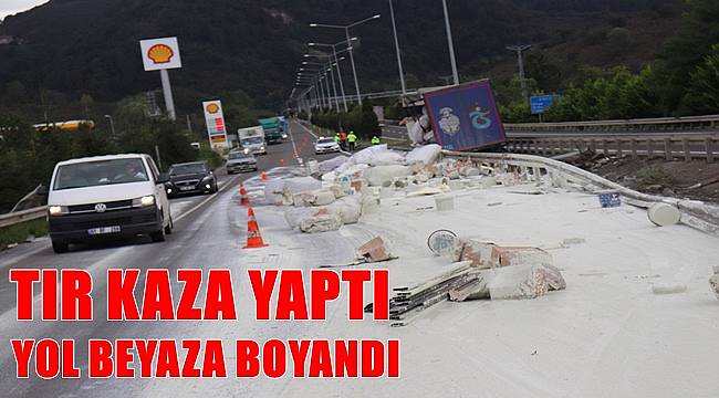 Kazada savrulmanın etkisiyle Tır’da bulunan boya kovaları karayoluna döküldü, yol beyaza boyandı.