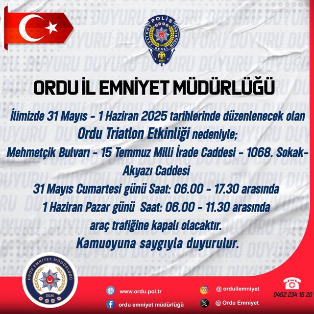 Ordu’da 31 Mayıs Cumartesi ve 1 Haziran Pazar günleri gerçekleştirilecek triatlon yarışları nedeniyle kent merkezinde bazı yollar geçici olarak araç trafiğine kapatılacak.