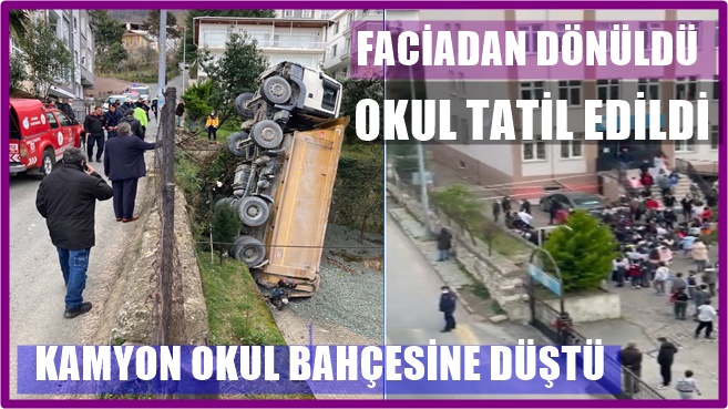 Ordu’da bu sabah faciadan dönüldü. Rampa yukarı giden kamyon geri kaçıp okulun bahçesine düştü. Kamyonun 5 metre ileride bahçede oynayan çocukların üzerine gelmemesi bir faciayı önledi. Tedbir olarak okul bugün tatile edildi.