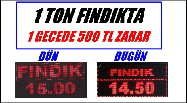 Serbest piyasada fındık fiyatları 16 TL’den giriş yaptı. Daha sonra düşüşe geçen fiyatlar 3 Eylül Salı günü 14.50 TL’ye kadar geriledi. Fiyatlar dün 15.00 TL idi. Bir ton fındığı olan bir üretici bir gecede 500 TL zarar etmiş oldu.
