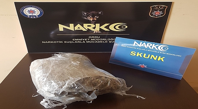 Ordu Emniyet Müdürlüğü Narkotik Suçlarla Şube Müdürlüğü ekiplerince Altınordu otogarında durumundan şüphe edilen bir kişinin valizinde 1 kilo 50 gram skunk maddesi el geçirildi. Adliyeye sevk edilen şüpheli tutuklanarak cezaevine gönderildi.