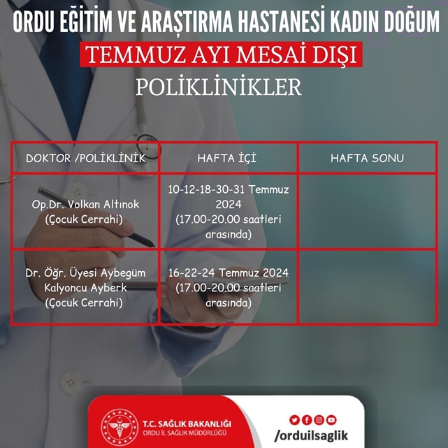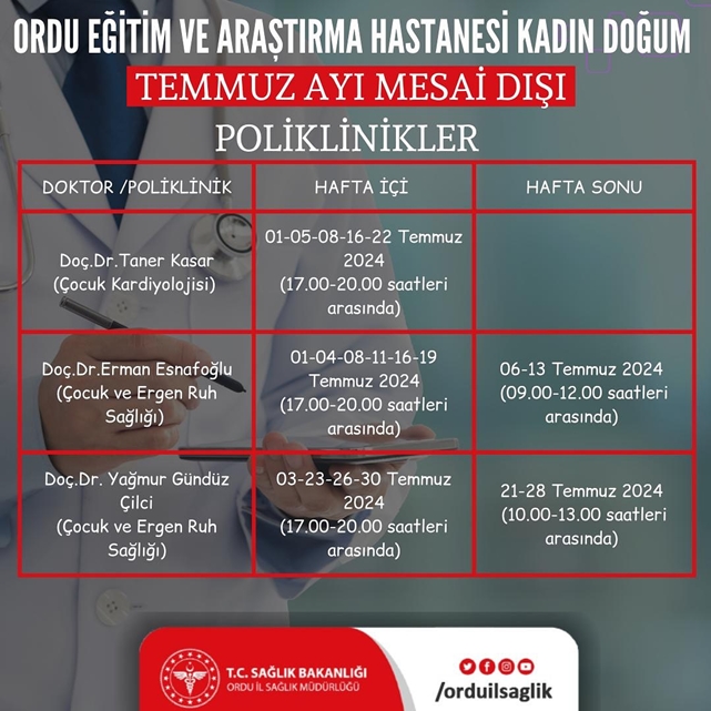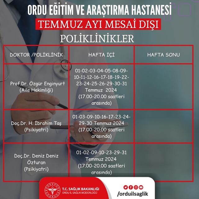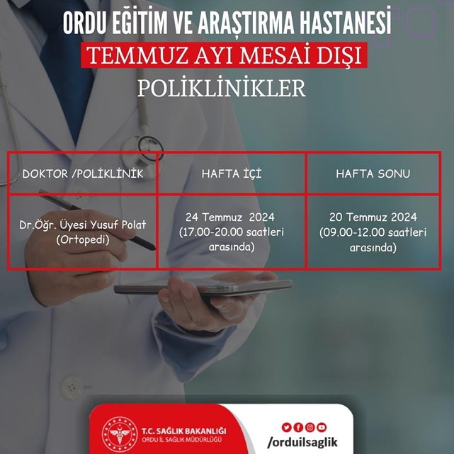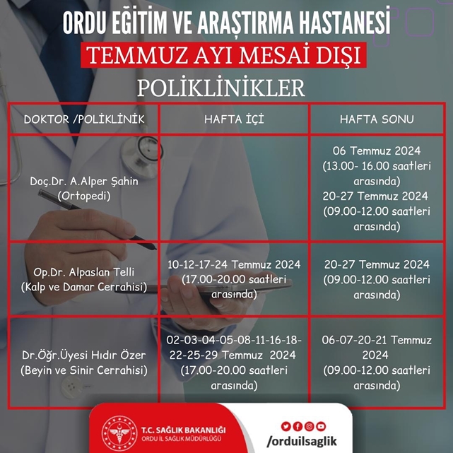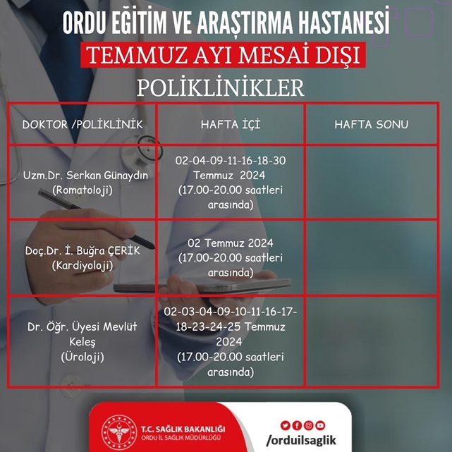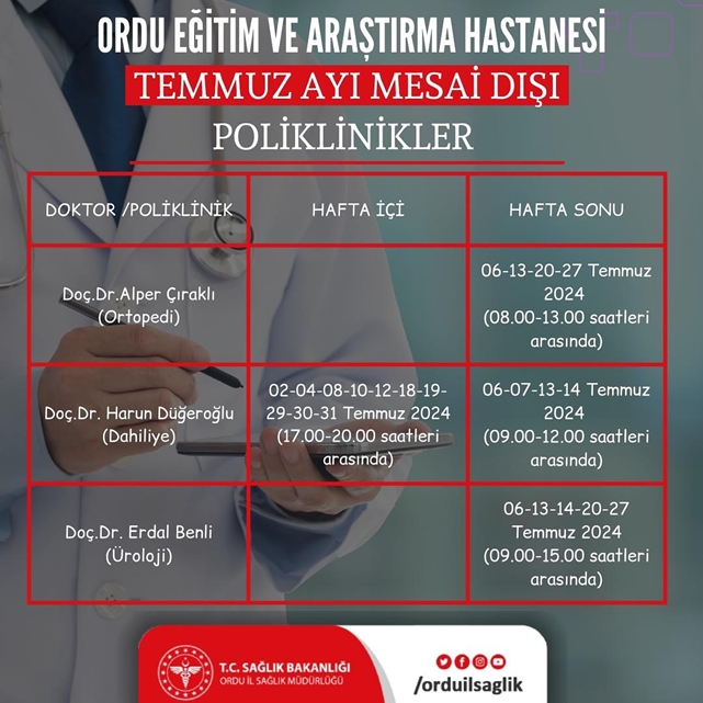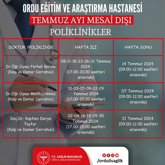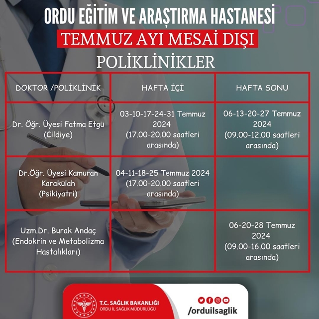 Hasta yoğunluğunun önüne geçilebilmek için Ordu Üniversitesi Eğitim ve Araştırma Hastanesi'nden bugünden itibaren mesai saati dışında da doktorlar hasta kabul edecek. Hafta içerisinde saat 17.00'den sonra hafta sonları da Cumartesi günü hasta bakılabilecek.