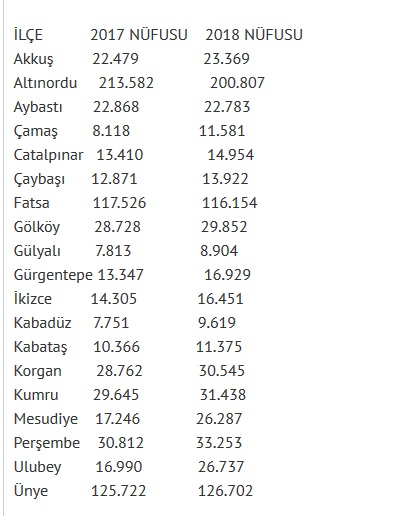 Ordu’nun 2018 yılı sonu itibariyle nüfusu 771 bin 932 kişi olarak belirlendi. Bir yıl önce Ordu’nun nüfusu 742 bin 341 olmuştu. Ordu 1 yılda 29 bin 591 göç almış oldu. Artışın il dışında bulunan Orduluların yerel seçimlerinde memleketlerinde oy kullanmak için ikametgahını Ordu’ya aldırmalarından kaynaklandığı tahmin ediliyor.