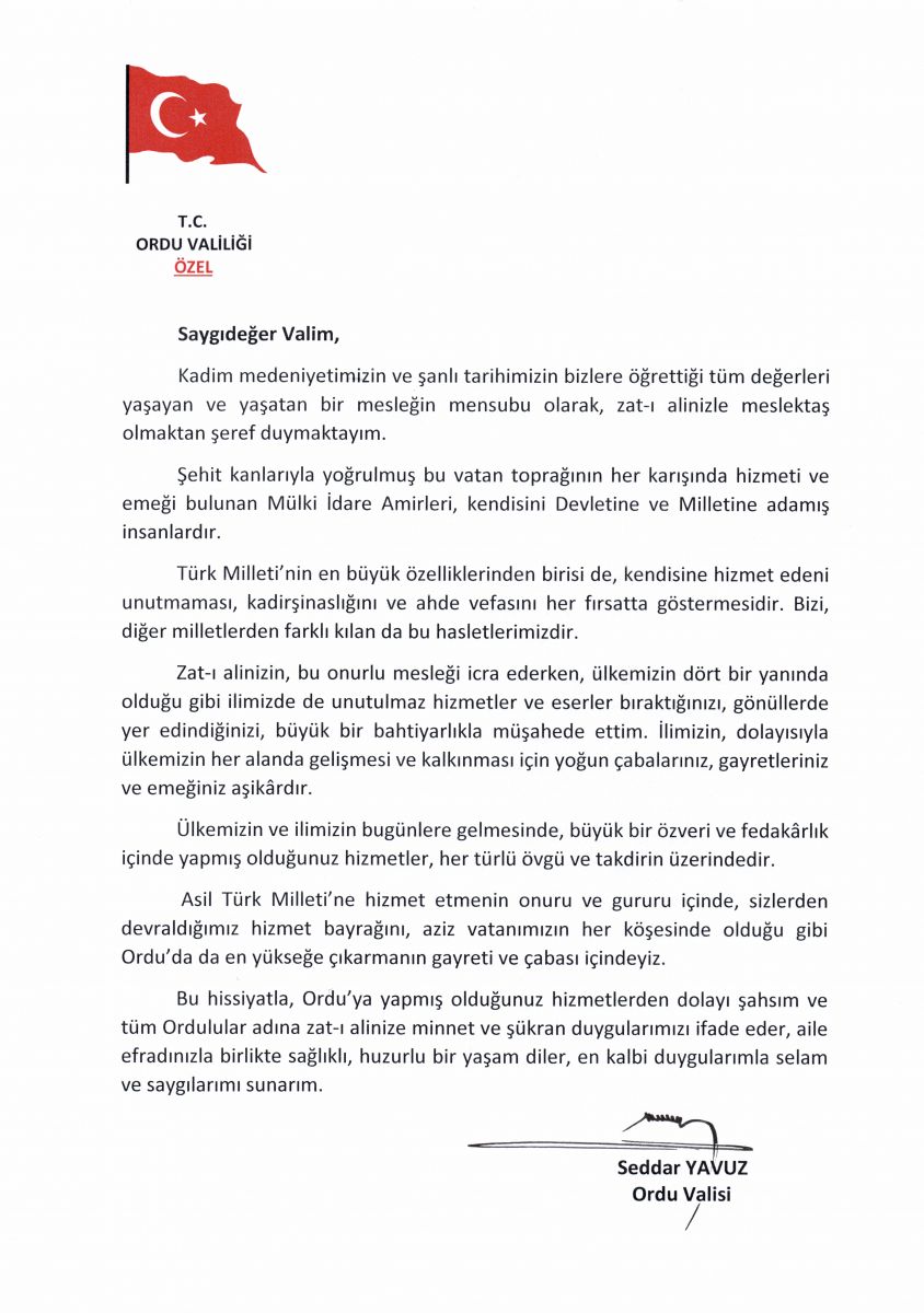 Vali Seddar Yavuz, Ordu’da görev yapan ve halen hayatta olan Valilere bir mektup göndererek, Ordu’ya yaptıkları hizmetten dolayı teşekkür etti.