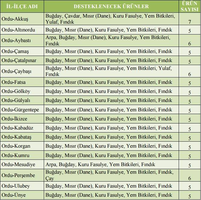 2017 sezonunda uygulamasına geçileceği bu model kapsamında desteklenecek ürünlerin Ordu’daki dağıtım listesi şöyle;