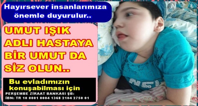 Anne Fatma Işık, hayırsever insanlara çağrıda bulunarak “Umut Işık oğlumuz Seraplal palsi modullstom beyin amaliyatı geçirdi, Skolyoz var ,omurlilikten amaliyat olması gerekli. Bu tedaviler için gideceğimiz hastanede devlet katkı payi ücreti olarak bizden 250 bin TL. istiyorlar. Bu nedenle Ordu valiliğinden yardim toplama kampanyası için izin belgesi aldık gerekli miktar 250 bin TL için yardımlarınızı bekliyoruz” diyerek hayırsever insanlara çağrıda bulundu.