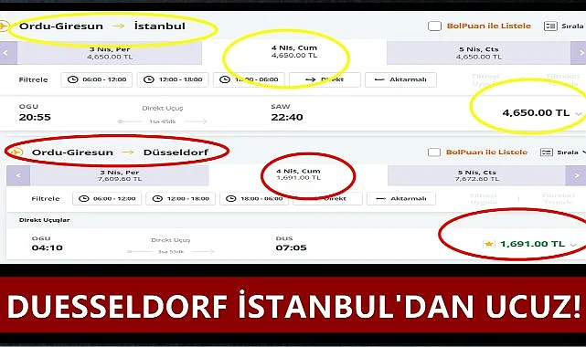Pegasus Ordu Giresun'dan Duesseldorf ilk sefer için bilet fiyatlarını indirdi. İlk uçuş için bilet fiyatı 1691 TL'den satılıyor. Pegasus'un Duesseldorf biletlerini 1691 TL'den satarken aynı gün İstanbul biletlerini 4 bin 650 TL'den satması dikkat çekiyor.