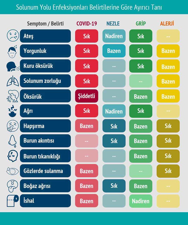 Koronavirüs ve grip virüslerinin sebep olduğu şikayetlerin hemen hemen aynı olması ve diğer üst solunum enfeksiyonlarının gösterdiği belirtilerin birbirine karıştırılmaması için bir aşağıdaki tablodan yararlanabilirsiniz.