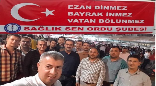 Sağlık Sen Ordu Şubesi demokrasi nöbetlerini terk etmeyen sendikaların başında geliyor. İlk andan bu zamana kadar Ordu Büyükşehir Belediyesi’nin önünde düzenlenen darbe karşıtı tüm etkinliklere tam kadro katılan Sağlık Sen Ordu Şubesi Başkanı Bilal İnanlı, “Cumhurbaşkanımız ne zaman’ evlerinize dönün ‘derse bizde meydanları terk ederiz”dedi.