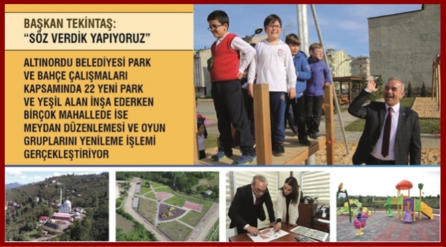 Modern ve yaşanabilir bir Altınordu parolası ile çalışmalarını sürdüren Altınordu Belediyesi bu kapsamda çocuk oyun parkları ve yeşil alanlar inşa etmeye devam ediyor. 30 Mart yerel seçimlerinden bu yana Altınordu Belediyesi Park ve Bahçeler Müdürlüğü tarafından Altınordu’ya 22 yeni park inşa edildi. İlçenin birçok mahallesine yeni parklar ve yeşil alanlar kazandıran Altınordu Belediyesi şehrin nefes almasına katkı sunacak bu alanlarda modern çocuk oyun grupları, fitnes spor alanları, oturma grupları, yürüme yolları ve aydınlatma gibi modern sistemler yerleştirdi. Parklardaki en büyük özellik ise 7 gün 24 saat güvenlik kamerası ile izlenmesi olurken ailelerinde bu konuda tedirginliğinin azalması sağlandı.