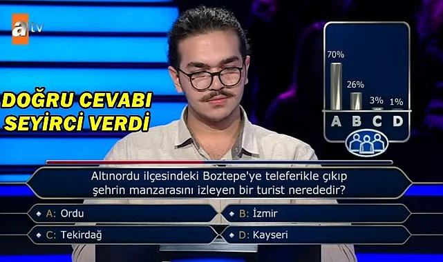 Yarışmacı İsa Habacı’ya sorulan soruda, “Altınordu ilçesindeki Boztepe'ye teleferikle çıkıp şehrin manzarasını izleyen bir turist nerededir?” ifadesi yer aldı. Şıklar arasında “A: Ordu”, “B: İzmir”, “C: Tekirdağ” ve “D: Kayseri” seçenekleri bulunuyordu.