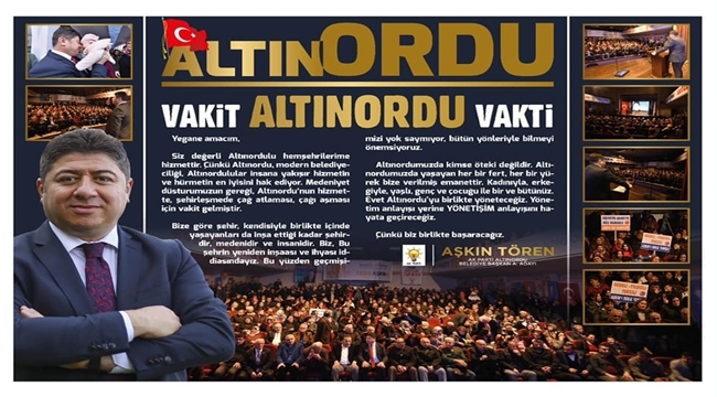 AK Parti Altınordu Belediye Başkan Aday Adayı Aşkın Tören,” Siyaset; Gönüller Yapmak, İnsanımızın hayır dualarına, İyi dileklerine muhatap olmaksa; bizim siyasetimizin adı ‘ Merkezi insan olan hizmet siyaseti olacaktır’” dedi.