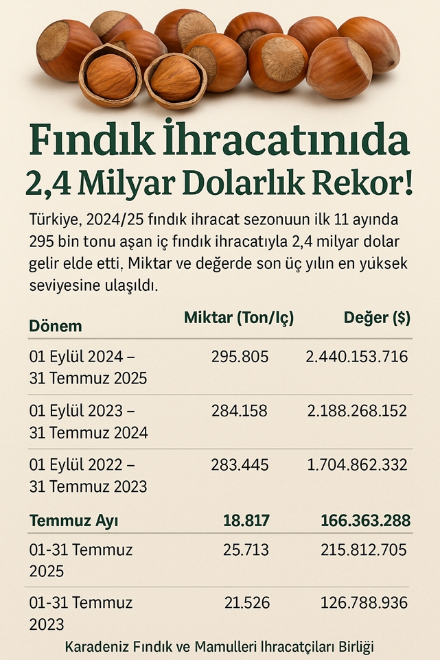 Karadeniz Fındık ve Mamulleri İhracatçıları Birliği tarafından açıklanan verilere göre, 2024/25 ihracat sezonunun ilk on bir ayını kapsayan 1 Eylül 2024 – 31 Temmuz 2025 döneminde Türkiye, 295 bin 805 ton iç fındık ihraç ederek 2 milyar 440 milyon 153 bin 716 dolar döviz geliri elde etti.