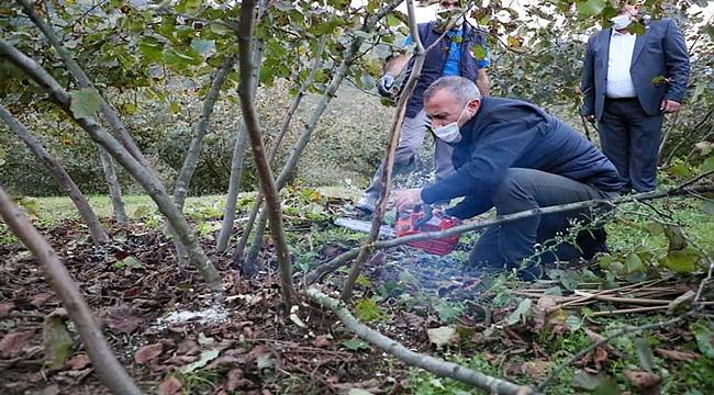Fındık budama timinde görev yapan ziraat mühendislerinden bilgi aldıktan sonra bıçkıyı eline alan Vali Tuncay Sonel, fındık filizi temizledi. Motorlu testere ile fındık dalı keserek, örnek budama çalışmalarında bulundu.