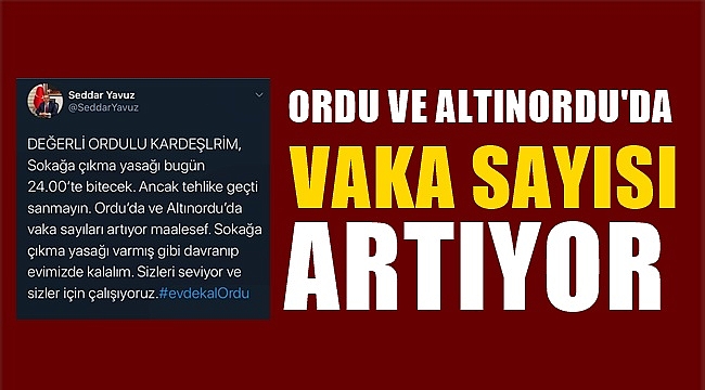 Vali Yavuz, “Değerli Ordulu kardeşlerim; Sokağa çıkma yasağı saat 24.00’de bitecek.Ancak tehlike geçti sanmayın.Ordu’da ve Altınordu’da vaka sayıları artıyor maalesef. Sokağa çıkma yasağı varmış gibi davranıp evimizde kalalım.Sizleri seviyor sizler için çalışıyoruz”