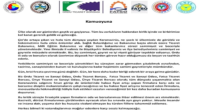Biz Ordu Ticaret ve Sanayi Odası, Ordu Ticaret Borsası, Fatsa Ticaret ve Sanayi Odası, Fatsa Ticaret Borsası, Ünye Ticaret ve Sanayi Odası, Ünye Ticaret Borsası olarak; tüm dünyada yaşanmakta olan Koronavirüs salgınını fırsat görüp de ürünlerinde haksız fiyat artışı yapan firmalara karşı oda ve borsamız disiplin mekanizmalarını çalıştıracağımızı ve bu haksız fiyat artışına tenezzül eden firmalara, mevzuatlarda hükmedildiği hâliyle hak ettikleri cezaları vereceğimizi bir kez daha buradan kamuoyuna duyururuz.