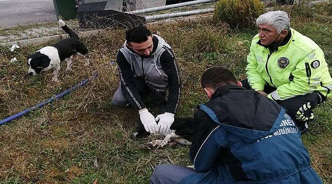 İl Emniyet Müdürlüğü Bölge Trafik Denetleme Şube Müdürlüğünde görevli polis memurları Yavuz Bayrakdar ile Abdullah Coşkun, görevleri sırasında Samsun-Ankara kara yolu Çakallı mevkisinde yol kenarında yaralı sokak köpeğini fark etti.