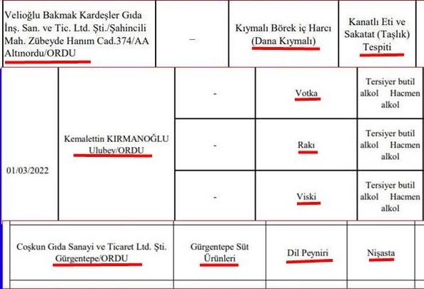 Ordu’da ise Altınordu Şahincili Mah. Zübeyde Hanım caddesi üzerinde faaliyet gösteren, Velioğlu Bakmak kardeşler gıda Dana kıymadan yaptıkları kıymalı börek harcının içine Kanatlı et ve sakatad ile taşlık kattıkları, Gürgentepe ilçesinde faaliyet gösteren Coşkun gıda sanayi ve Tic. Ltd. Şti’nin ürettiği Dil peynirinin içine Nişasta kattığı ve Ulubey ilçesinde faaliyet gösteren Kemalettin Kırmanoğlu adlı satıcı, Votkanın, rakının ve viskinin içine tersiyer butil alkol ve hacmen alkol kattığı tespit edilmiştir.